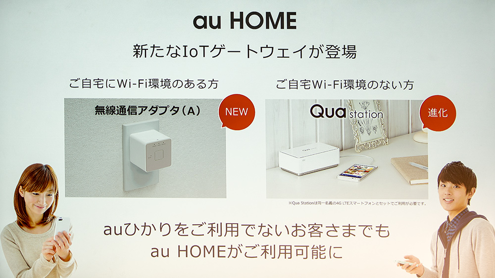 au HOMEはインターネットサービス「auひかり」のみのサービスだったが、au IDを持っているユーザーで尚かつ自宅にWi-Fi環境がある場合は「無線通信アダプタ(A)」を、Wi-Fi環境がない場合は4G LTE搭載フォトストレージ「Qua stashon」でau HOMEが利用可能となる。両製品ともにIoT機器との通信を「Z-Wave」で行う。