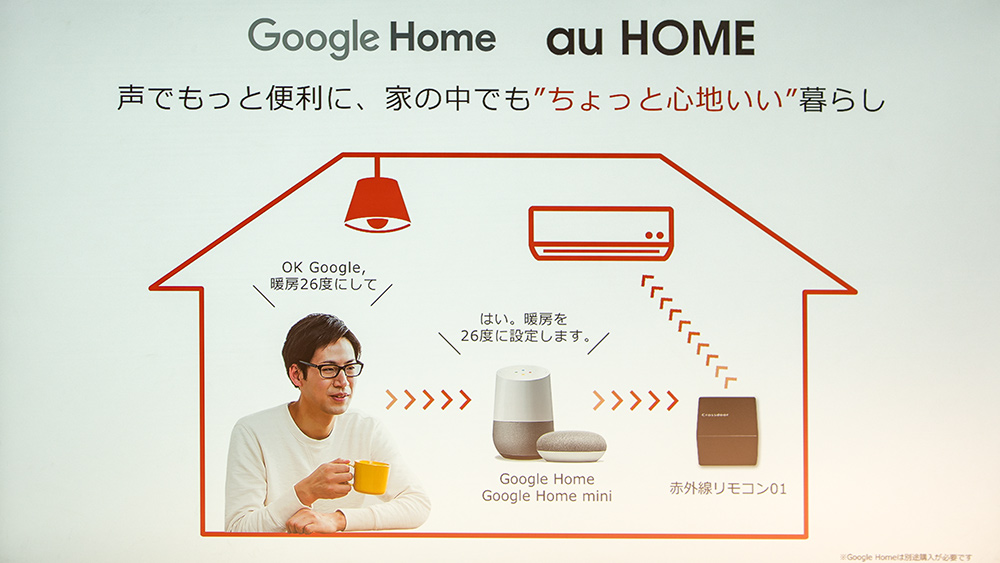 Google Homeがあれば無料で家電製品をコントロールすることも可能だが、au HOMEは基本利用料 月額490円(初期費用2,000円)が必要となる。一方で、au HOMEはGoogle Homeですらその世界感の1つとして利用するホームIoTプラットフォームであることがポイントだ。