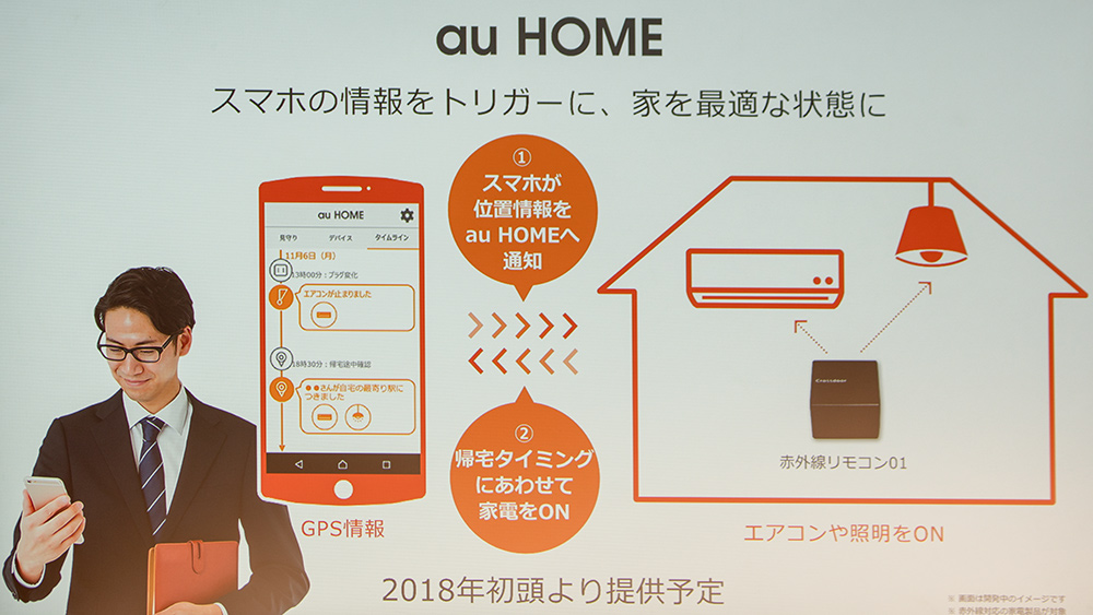 こうした家電コントロールを次に推し進めるのが、スマホの情報をトリガーにして家を最適な状態することを双方向通信で行う。スマホの位置情報で帰宅のタイミングに合わせて赤外線リモコンから家電製品をコントロールする。この機能は2018年初頭に提供予定としている。