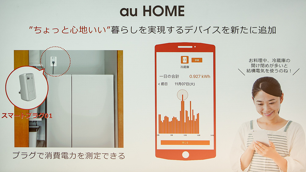 au経済圏とも言うべき「auでんき」や「Wowma!」と、au HOMEの連携として家電製品の電気使用量を可視化するIoT機器「スマートプラグ01」を発売する。