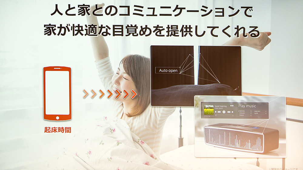 まずホームIoTサービスの事例として、通信は片方向という条件とはなるが、起床時にスマホ連携でカーテンが開き、音楽が鳴るというシーンを紹介。