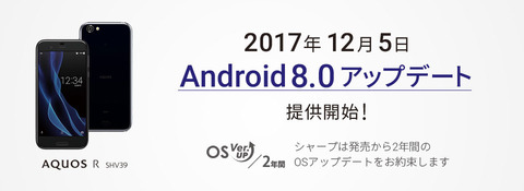 KDDIおよび沖縄セルラー電話は1日、au向け「2017年夏モデル」として発売したシャープのフラッグシップスマートフォン(スマホ)「AQUOS R(型番:SHV39)」に対して最新プラットフォーム「Android 8.0(開発コード名:Oreo)」を含むソフトウェア更新を2017年12月5日(火)より提供開始するとお知らせしています。