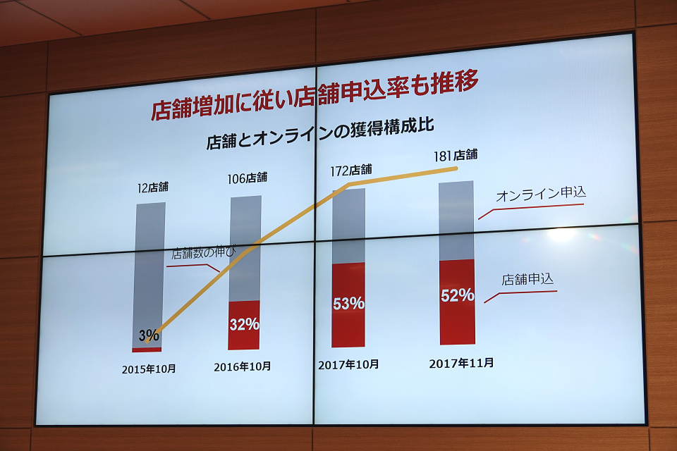 店舗展開では契約情報のビッグデータを活用し、オンラインでの申し込みが多く店舗展開されていない地域を重点的に出店することで効率的な集客と契約獲得につなげていると説明。また「ウェブと店舗では顧客獲得コストはあまり変わらない」とも語り、店舗展開が事業の大きなコスト増とはなっていない点や、むしろ店舗数の増加が「看板」としての役割を持ちつつある点も示唆しました。