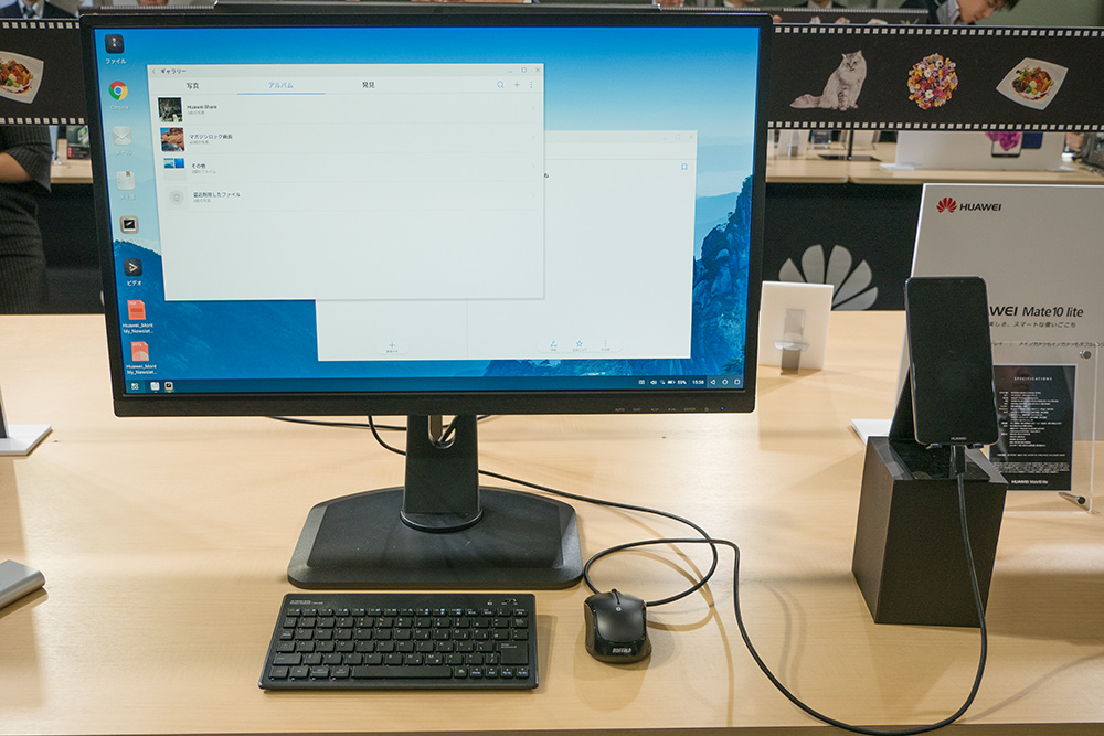 さて、続いて冒頭で特長として挙げたMate 10 ProをデスクトップPCのように利用できるPC MODEを紹介しよう。外部モニターとUSB Type-C接続のディスプレイケーブルでMate 10 Proを接続すると、写真のようにウィンドウ表示可能なデスクトップ画面が表示される。オプションのハードウェアを必要としない点がシンプルで良い。