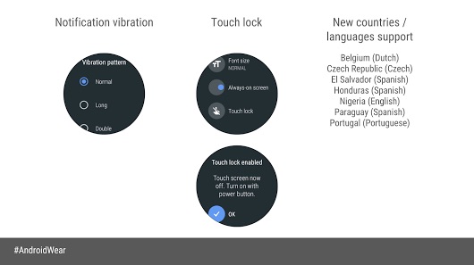 Android Wear Oreo 8.0ではスマートフォン(スマホ)など向けのAndroid 8.0 Oreoと同様にバッテリー節約のためのアプリのバックグラウンドでの動作制限が追加されたり、通知表示周りの変更やバイブレーションの強さ調節追加、水に濡れた状態でタッチパネルの誤動作を防ぐためにタッチロック機能追加などが行われています。