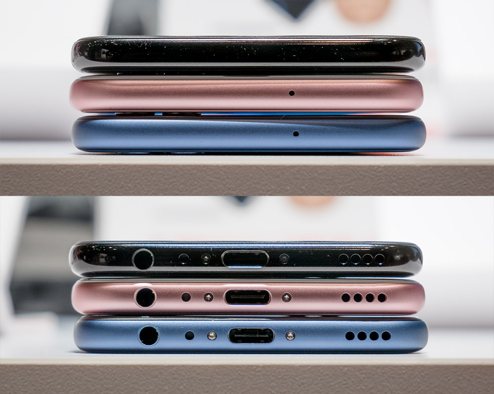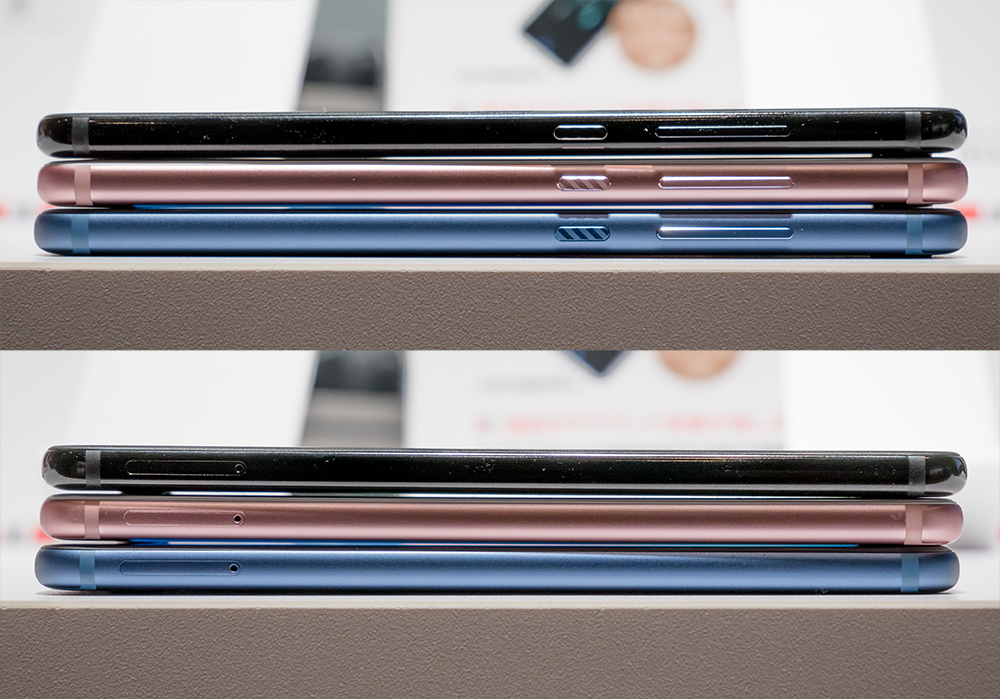 右側面に(写真=上)には、電源キーと音量上下キーがある。グラファイトブラックは側面が光沢仕上げとなっている。左側面(写真=下)にはnanoSIMカード、microSDXCカードスロット(最大128GBまで)がある。