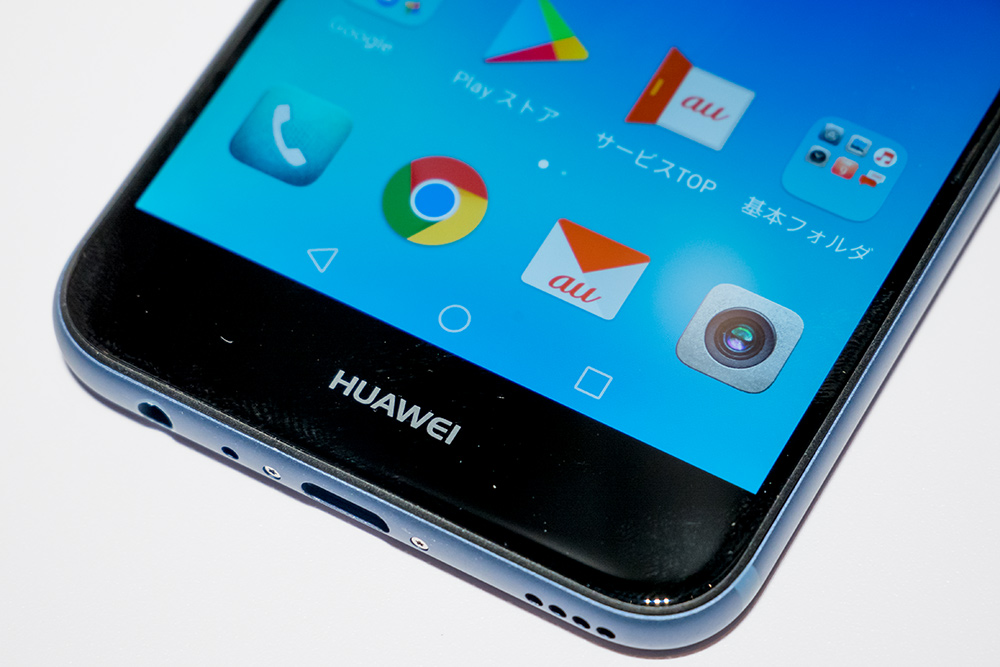 その他では指紋センサーの下には「au」ロゴがあるが、UQ mobile版ではキャリアロゴはないようだ。背面下部にも「HUAWEI」ロゴが配置されているものの、HUAWEI P10シリーズのようなファーウェイのロゴマークの記載はない。