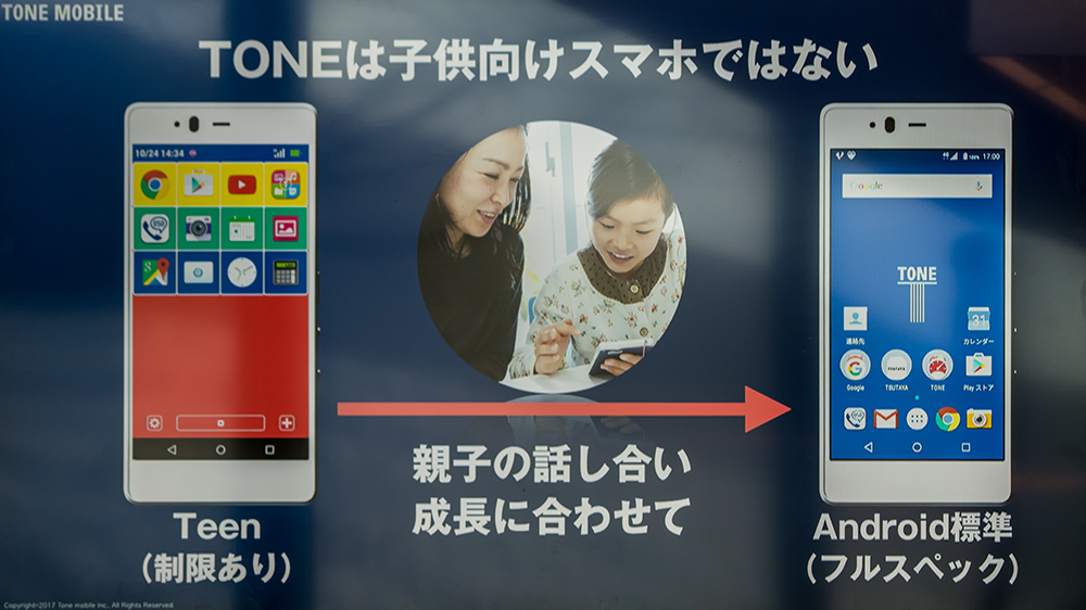 TONEモバイルのスマホは子ども向けの制限付きのものであっても成長に合わせてフルスペックのAndroidスマホとして利用できる。シニア向けのスマホも同様に簡単操作ができる状態でスタートし、慣れたらフルスペックのAndroidとして利用することも可能であり、世代に合わせて専用製品を別途購入する必要がないということをアピールしていた。