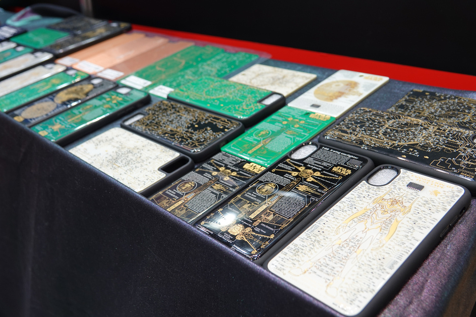 | <電子技販ブースのプリント基板を使った芸術的なスマホケースなどを紹介!/strong> |