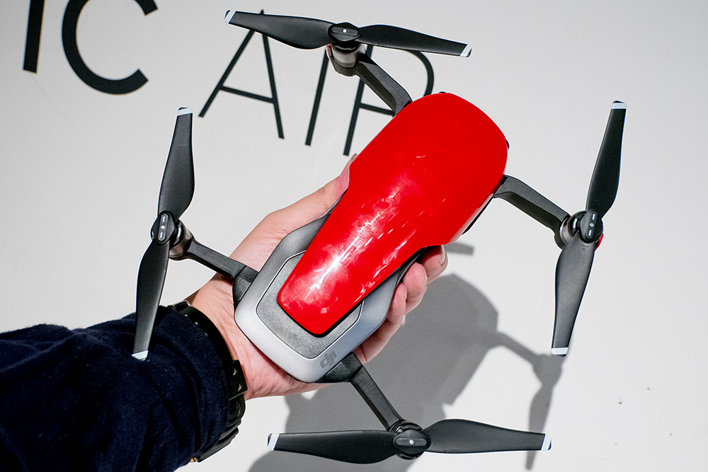 Mavic Airの左右前方のプロペラの下に脚があり、そこにアンテナが埋め込まれているという。カラーは写真の「Flame Red」の他に「Active White」、「Onyx Black」がある。