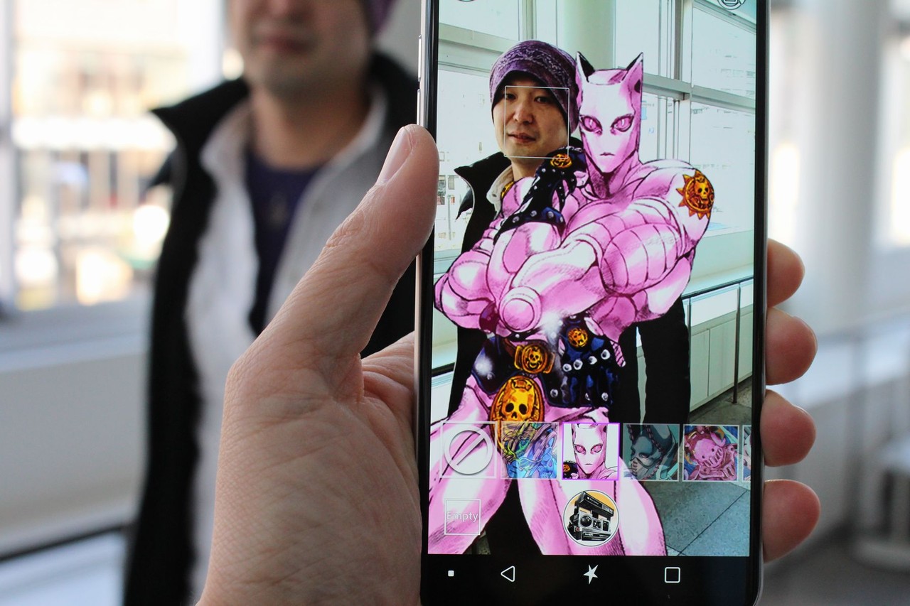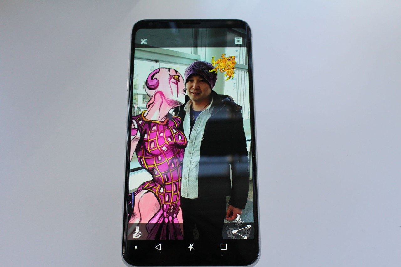 カメラアプリでは人を撮影すると、AR機能で各種キャラクターと一緒の撮影も可能です。撮影後にさまざまなキャラクタースタンプを使って、キャラクターを追加することもできます。