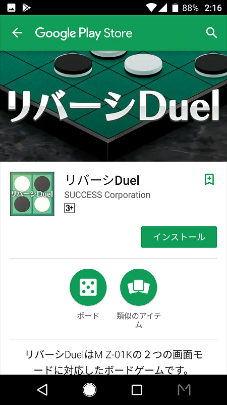プリインストールされてはいませんが、ホーム面内に「リバーシDual」というアイコンがあります。これはアプリ配信マーケット「Google Playスト」内の「リバーシDual」のダウンロードページへのショートカットアイコンになっており、ここからリバーシDualのアプリをM Z-01Kにダウンロードしてインストールすることができます。