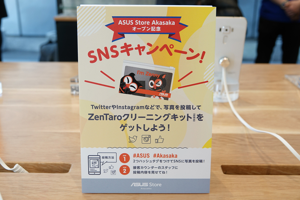 またTwitterとFacebook、Instagramの3つのSNSを対象としたキャンペーンとして、来店時にハッシュタグ「#ASUS #Akasaka」をつけて同店舗について投稿した方先着700名に、ASUSのマスコットキャラクター「禅太郎」のデザインのPCクリーニングキットをプレゼントしています(SNS投稿後にレジスタッフへ画面をご提示ください)。