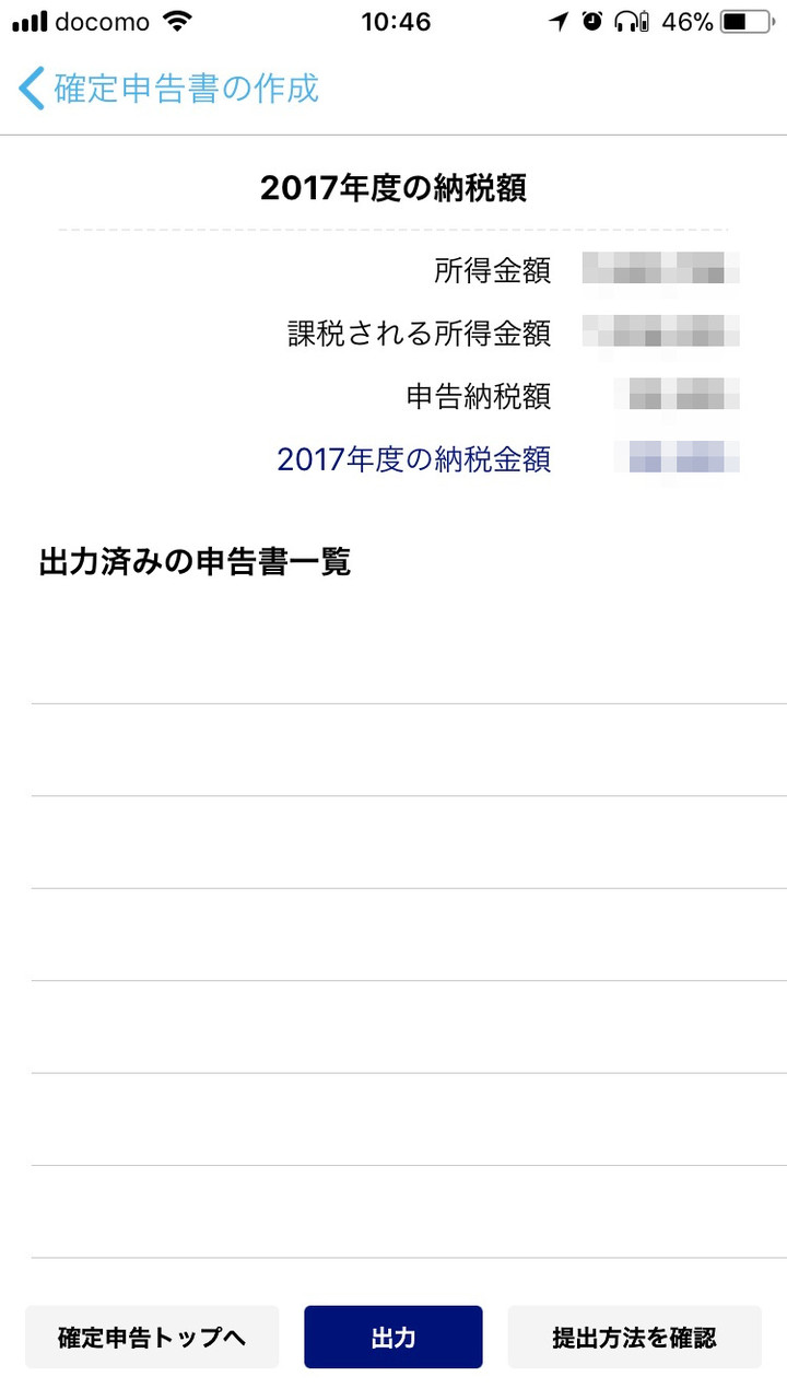 最後に納税金額などが表示されます。「出力」をタップすると申告書が作成されます。