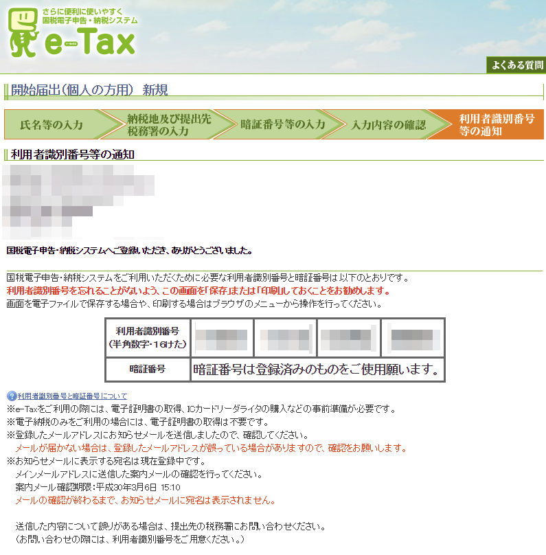 この2つが準備できたら、まずはじめに国税庁の電子申請・納税システム「e-Tax」のWebサイトで開始届出の新規登録を行います。登録が完了すると利用者識別番号が通知されます。