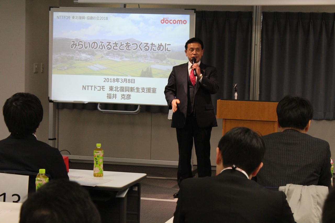 その後、NTTドコモが震災後に立ち上げた東北復興新生支援室の担当部長福井克彦氏により「NTTドコモ東北復興新生支援室活動報告~みらいのふるさとをつくるために~」という活動報告がありました。