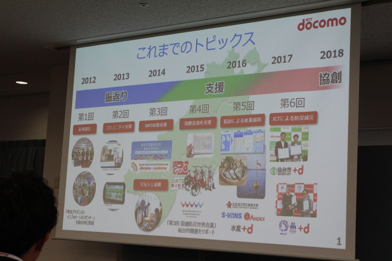 まずはこれまでのこの会の歩みを振り返り、震災直後から3回は震災時の振り返り中心、その後の3回は復興支援活動の紹介が中心となっていた点の説明があり、震災から7年を経過し、これからはNTTドコモがICT技術を生かし、東北の自治体やさまざまな団体と共に、新たな東北を創り出す「協創」のフェーズに入ったという認識が強調されました。