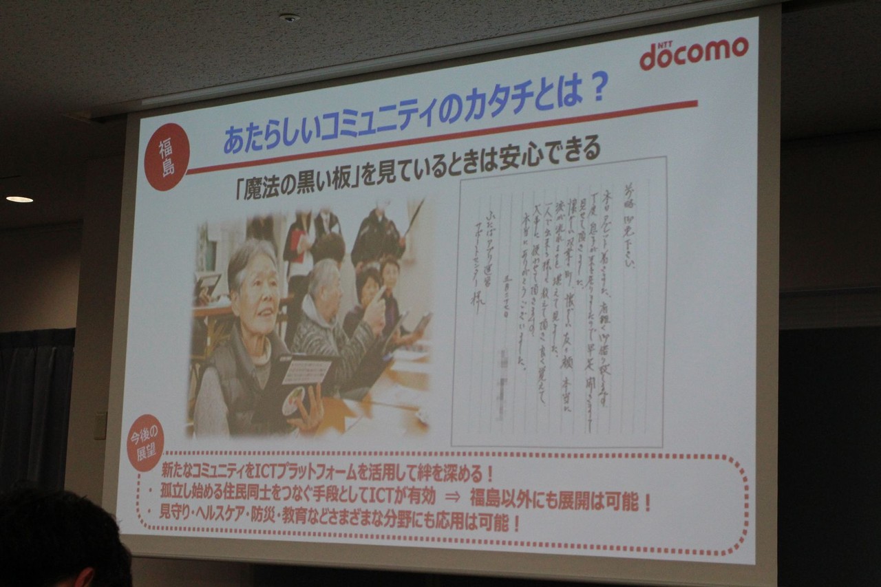 福島県相双地区でのタブレットを使ったコミュニティ支援は、原発事故の影響で町から離れた場所へ避難を余儀なくされている方々へタブレットを配布して、コミュニティのつながりを維持しようという試み。利用者から「魔法の黒い板」と呼ばれ、感謝の手紙をもらった時は感激したとのこと。