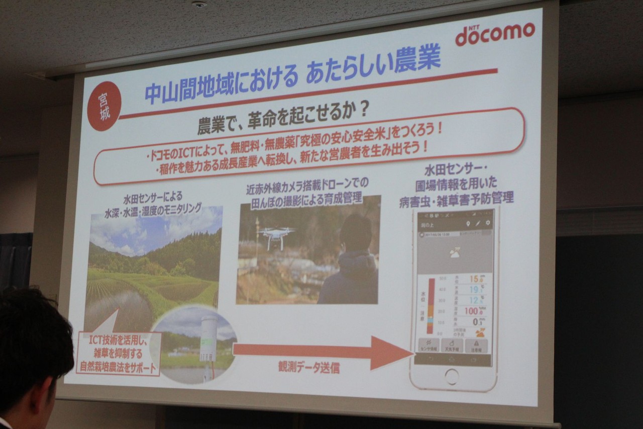 宮城県南三陸町などで行っているICT技術を用いた米作りでは、IoT技術を用いて水田の状況をスマホやタブレットでモニタリングし、無農薬のみならずなんと無肥料、すなわち土と水だけでの米(ササニシキ)作りを実現したとの報告がありました。普通の米と比べて非常に高値で売れたとのことで、みちのくマルシェでも販売され、好評を博していました。