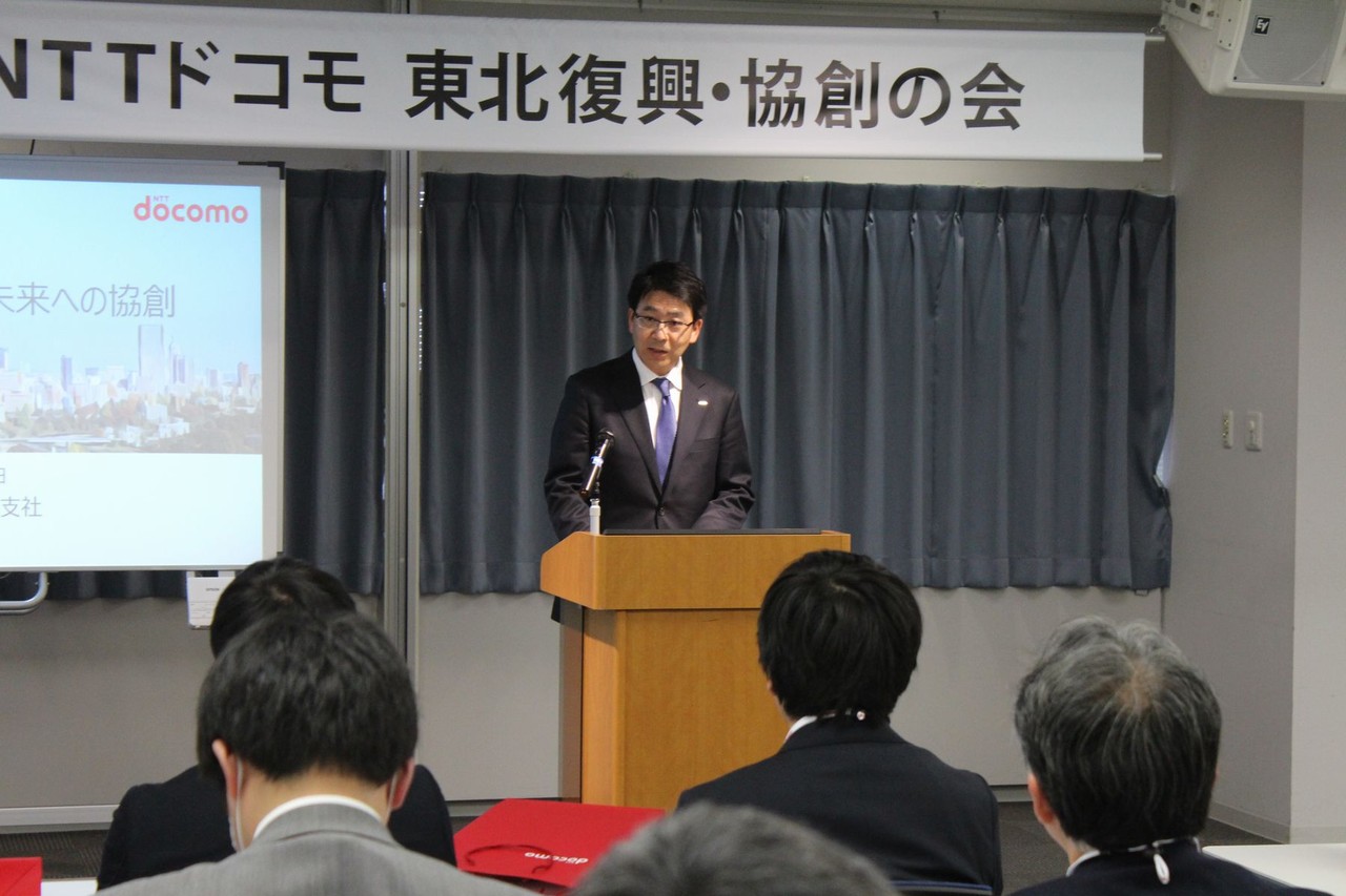 始めにNTTドコモ 執行役員 東北支社長の藤原道朗氏より「NTTドコモ取り組み状況報告 ~復興・創生、そして未来への協創」と題した取り組み状況報告がありました。