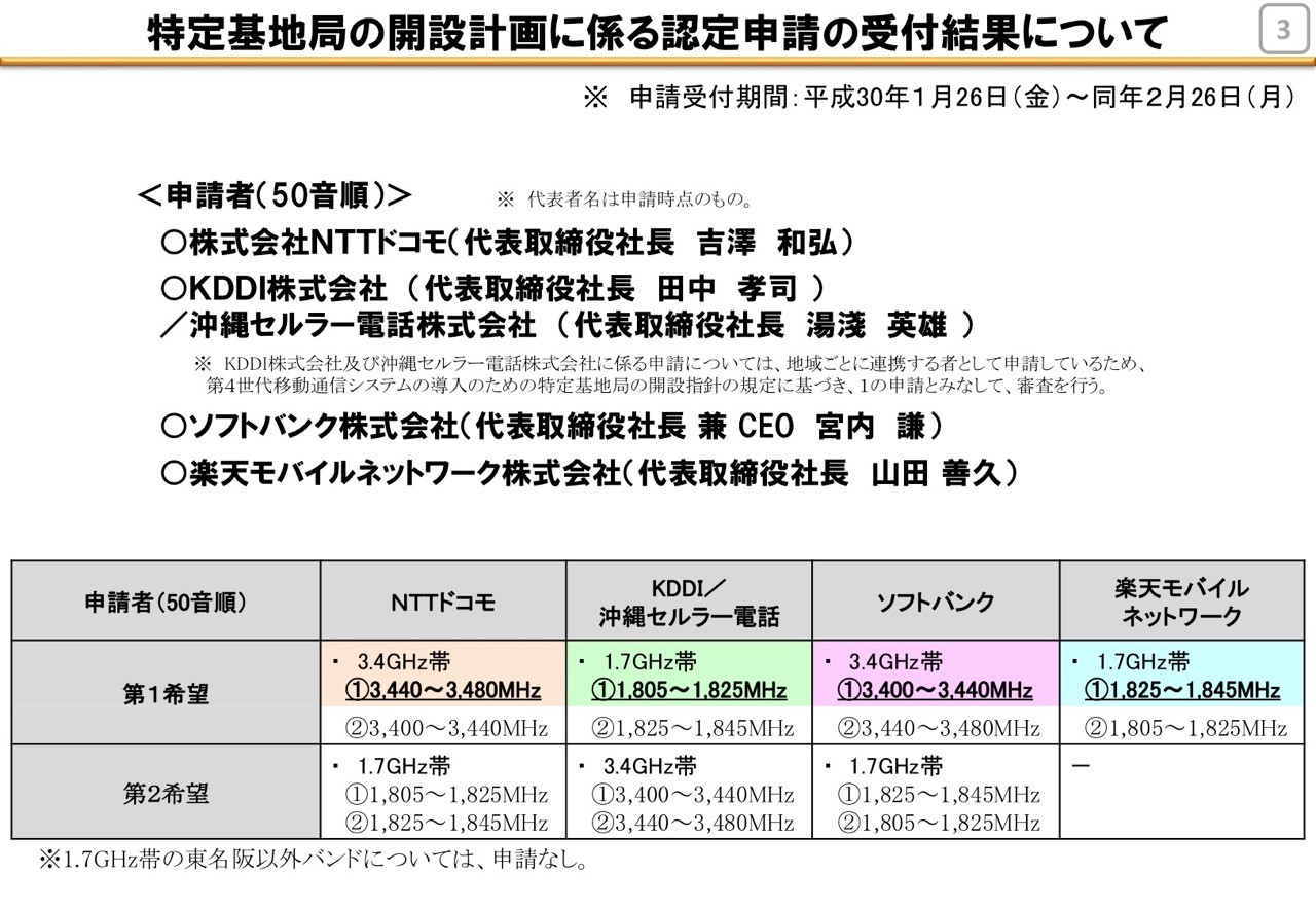 これまで1.7GHz帯では、ソフトバンクとNTTドコモの東名阪のみに40MHz(20MHz×2)が割り当てられており、3.4GHz帯はNTTドコモおよびKDDI・沖縄セルラー電話、ソフトバンクに40MHzが割り当てられており、それぞれ世界的にも標準バンドとして普及していることからさらなる4Gの促進のために周波数帯を整備して追加割り当てを計画していました。