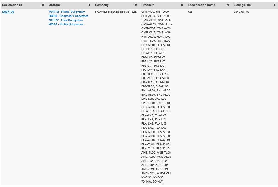 Bluetooth SIGではDeclaration ID「D037176」、Referenced Qualified Designs「86634(Controller Subsystem)」および「101927(Host Subsystem)」、「6540(Profile Subsystem)」としてBluetoothモジュールが登録されており、他の「HUAWEI nova lite 2」や「HUAWEI Enjoy 7S」、「HUAWEI P Smart」、「HUAWEI MediaPad M5」、「Honor 9 lite」などのさまざまな機種と同一モジュールとなっています。