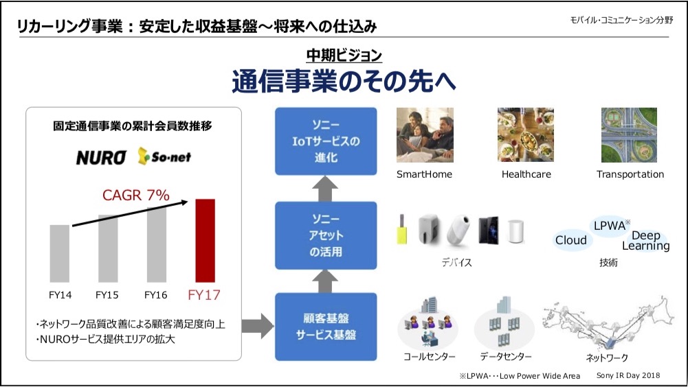 またコスト削減を進めてOPEXを2020年度までにさらに30%減らし、損益分岐点を低減させた筋肉質な構造への変革を行なっていくとのことで、MC分野も2020年度には200〜300億円の黒字をめざします。なお、これには2017年度決算説明会でも説明があったように「5G」への取り組みや規模は小さいながら右肩上がりのSNCも含まれます。