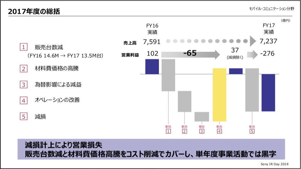 中でも最も大きな課題は2017年度における分野別では唯一の赤字となったスマートフォン(スマホ)などの「Xperia」シリーズを中心としたモバイルコミュニケーション(MC)事業だと思われます。
