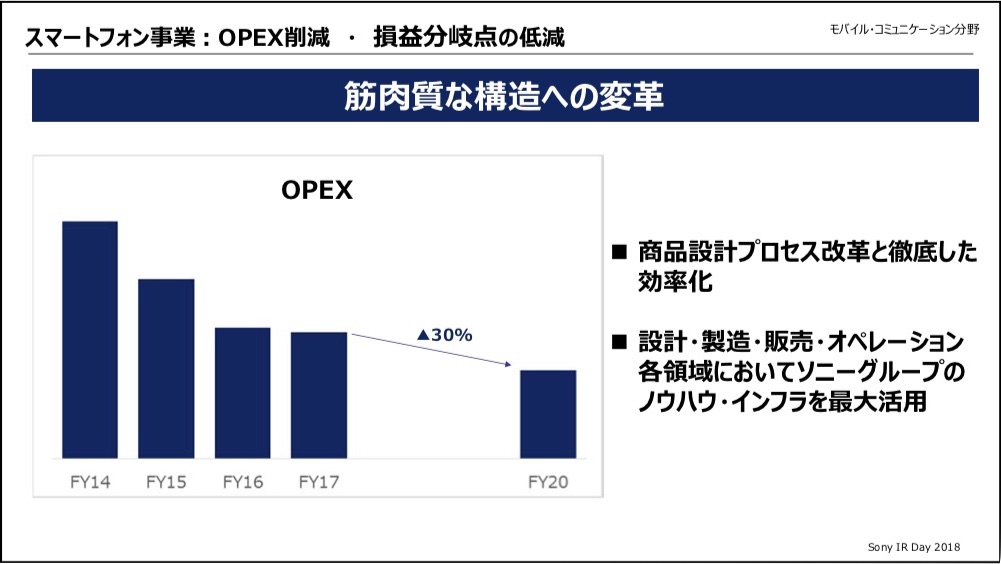 なぜこうした人事を説明しているかと言えば、スマホ事業において「できたこと」として「OPEX(運営コスト)」と「製品保証費用」の削減、いわゆるコスト削減が挙げられており、これはソニー銀行を立ち上げなどから財務畑出身の吉田氏の右腕となった十時氏の実績だと言えるからです。
