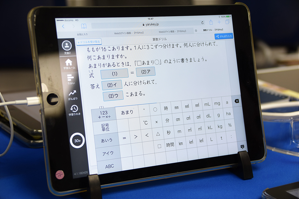 反転学習にはツールとして資料の配布・回収・作成・整理に株式会社LoiLo(ロイロ)が開発する授業支援アプリ「ロイロノート・スクール」、宿題など理解を深めるドリルとして凸版印刷株式会社の小学校向けドリル学習サービス「やるKey」も活用。