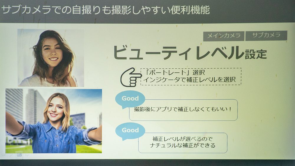 さらにメインとなるリアカメラだけでなく、フロントカメラとともに美肌効果などが得られる便利機能に対応。ビューティーレベルは撮影前に効果が確認できるため盛りすぎない自然な効果で撮影が楽しめる。