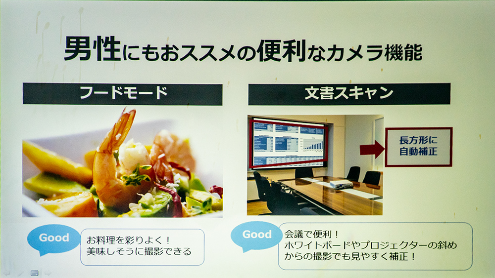 その他、自撮りをあまりしない人向けのカメラ機能としても料理の彩りが良くなる「フードモード」やホワイトボードや書類などを撮影するだけで歪みが補正される「文書スキャン」機能が紹介された。これらはプライベートでもビジネスでも使える便利なカメラ機能を覚えておくと良いだろう。