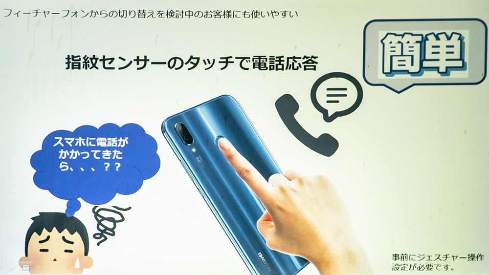 背面の指紋センサーのタッチで電話応答ができる機能も紹介。フィーチャーフォン(従来型携帯電話、いわゆる「ガラケー」)からの乗り換えなどでスマホの操作に慣れていなくても焦らずに指紋センサーをタッチするだけで電話に出ることができるとしている。
