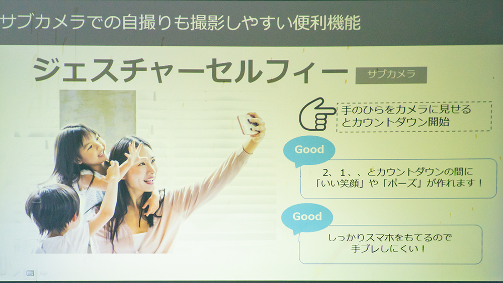 多人数で撮影する際に便利なのが、カメラに手のひらを見せる「ジェスチャーセルフィー」だ。カメラが手のひらを認識するとカウントダウンが始まるため、全員が撮影のタイミングを意識したベストショットが撮れると言うわけだ。