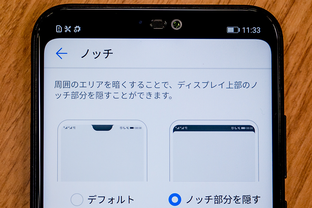 P20 liteの画面上部にはサブカメラやスピーカーを避けるようにノッチがある。このノッチは写真のように白い画面では目立ってしまう。