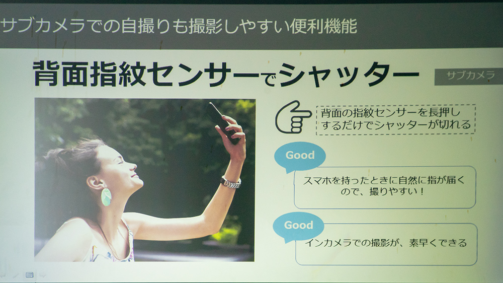 背面の指紋センサーは、ロック解除以外にシャッターボタンとしても利用可能だ。自撮りの際には、指紋センサーを “長押し”するだけの自然な操作で撮影可能である。