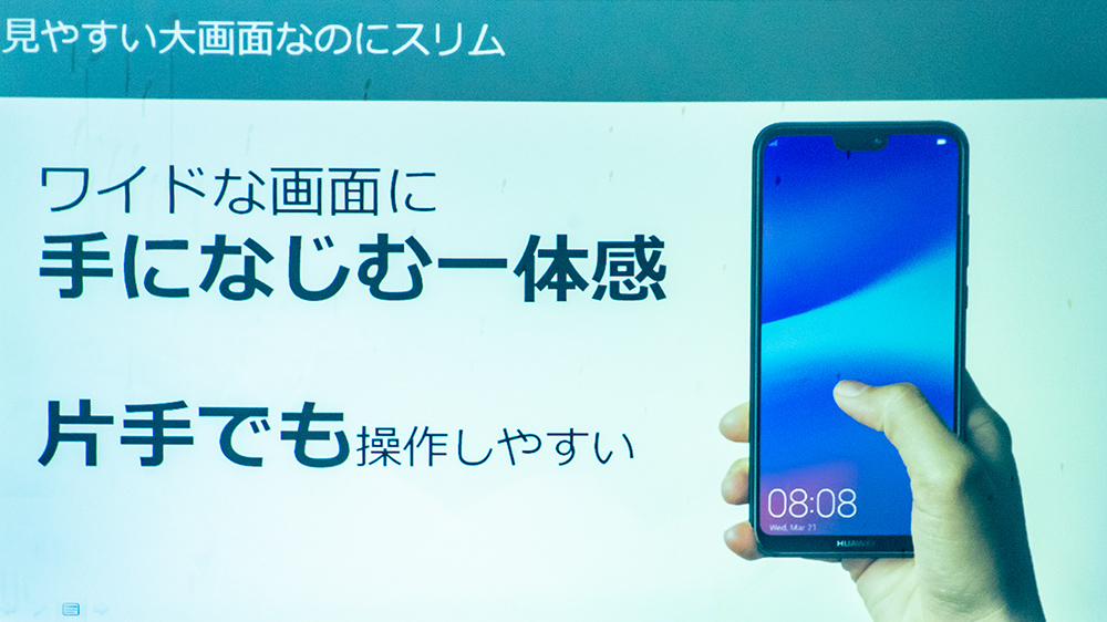 こういったトレンドを採用し、高コスパスマホ「HUAWEI nova lite 2」や「HUAWEI nova」などの従来モデルとの違いを前面に押し出している。また大画面でありながら横幅約71mm、厚さ約7.4mmと持ちやすいサイズであることもメリットである。