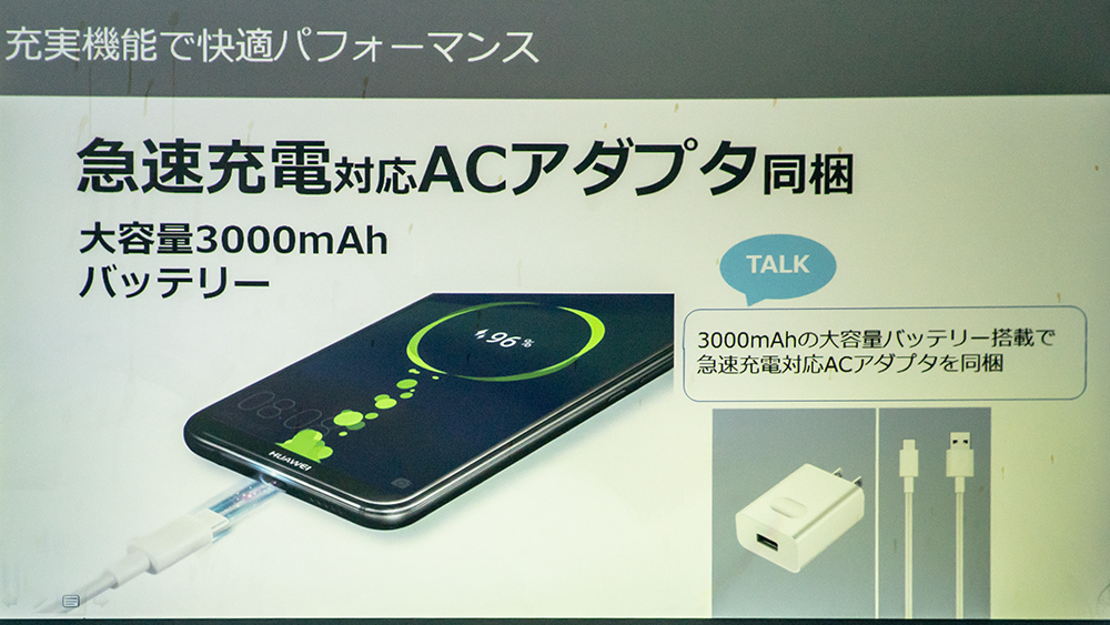 P20 liteは3000mAhの大容量バッテリーを搭載する。付属の急速充電対応ACアダプターなら大容量バッテリーも約100分で充電可能であるとしている。