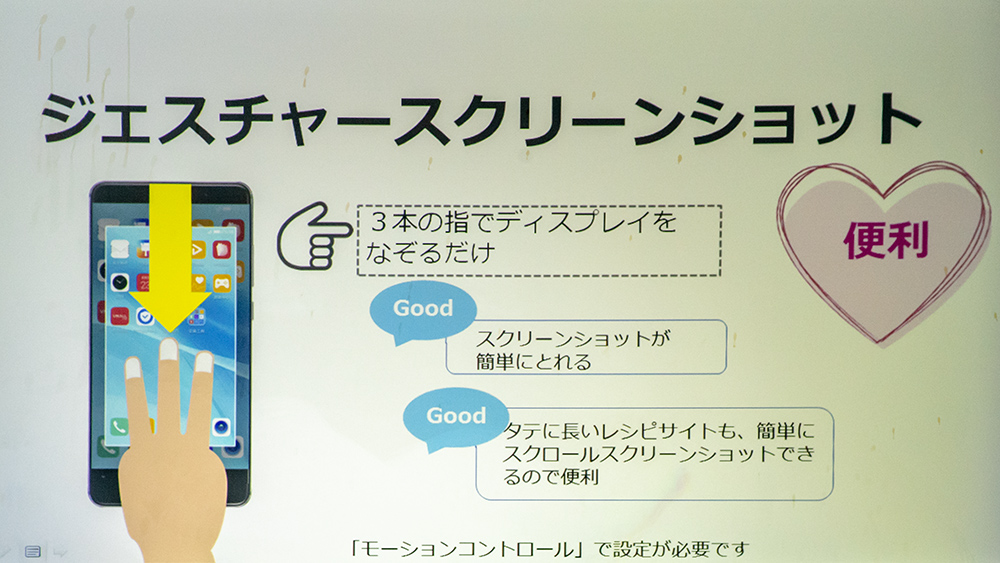 また便利機能としてスクリーンショットは3本指でディスプレイをなぞるだけで撮れることが紹介された。縦に長いWebサイトも「スクロールスクリーンショット」機能で広い範囲を保存可能である。