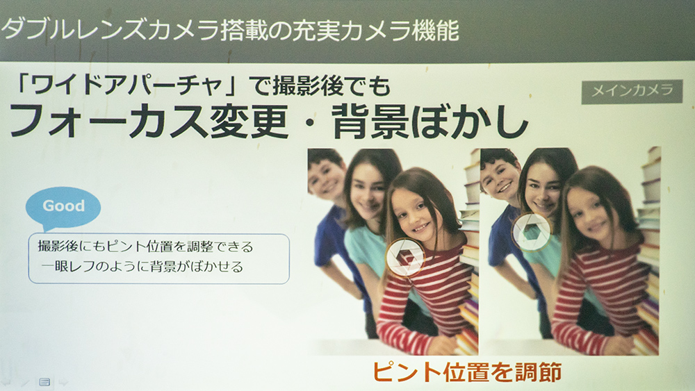 メインカメラは約1600万画素と約200万画素のダブルレンズカメラを搭載。ファーウェイのスマートフォンならではの「ワイドアパーチャ」を搭載。撮影時にボケ量の調整ができるほか、撮影後にもボケ量やフォーカス位置の変更が可能だ。特に面倒な設定の必要がないため、常にワイドアパーチャで撮影しておくのも良いだろう。