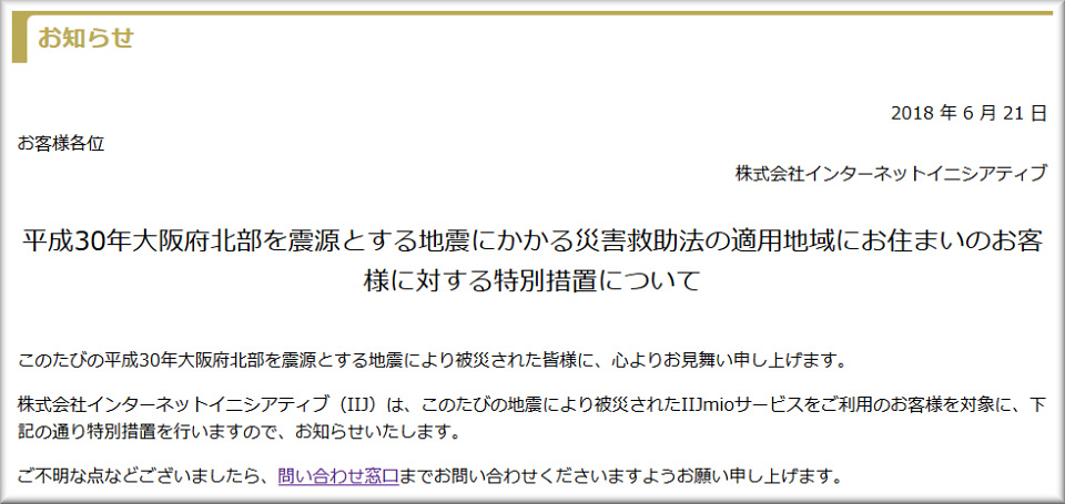 (更新)平成30年大阪府北部を震源とする地震に伴う支援措置について | ソフトバンク株式会社 | グループ企業 | 企業・IR | ソフトバンクグループ