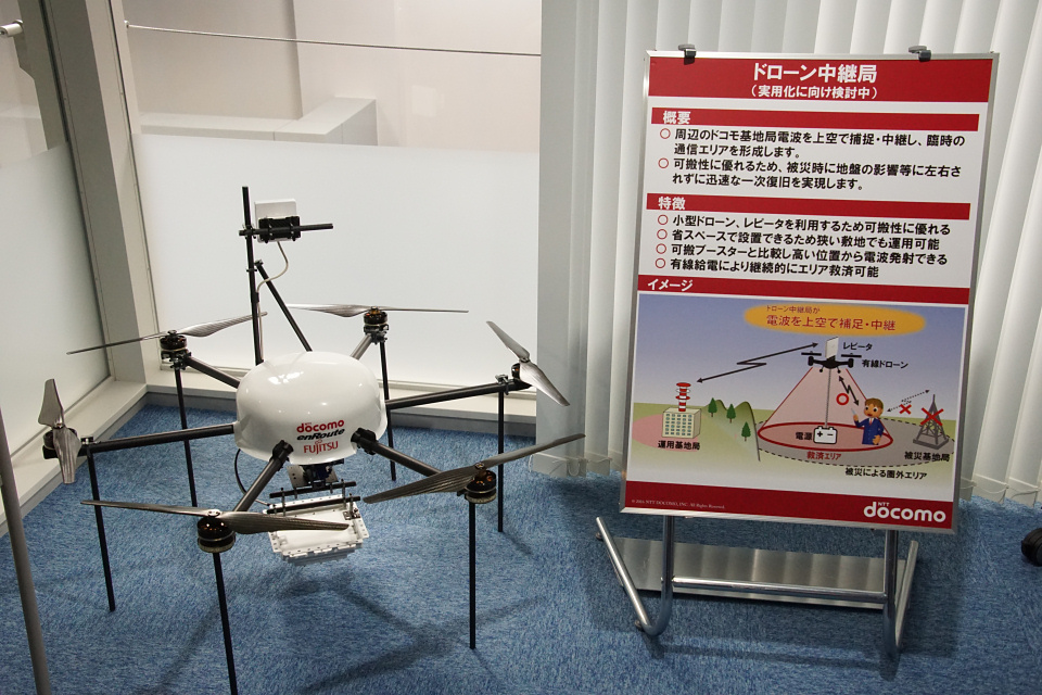 そして現在これらの災害対策として有望視されているのがドローン型基地局です。遠隔地から直接基地局機能を持ったドローンを飛ばすことも可能ですが、ヘリなどで現地へドローン基地局を運搬し、ケーブル接続などによって給電しながら避難場所の上空に飛ばすことで地上に置かれた可搬式移動基地局や移動基地局車両よりもより広いエリアをカバーでき、さらにドローンにカメラなどを備えることで災害状況などの確認にも活用できます。