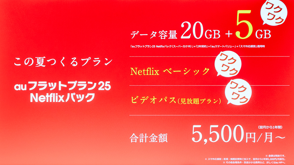 ・KDDIがNetflixとビデオパスの月額利用料金を含んだ新プラン「au フラットプラン 25 Netflix パック」を発表!20GB+5GBで月額5500円から【レポート】 - S-MAX