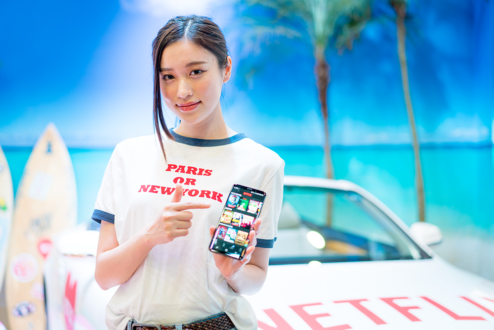 発表会終了後のサービス紹介コーナーは、ビーチのセットでNetflixを楽しむイメージを提案。25GBの大容量データ通信でどこでも自由に観られることのほかに、Wi-Fi環境下で観たい動画をあらかじめダウンロードしておいて、どこでも観られるということもアピールしていた。