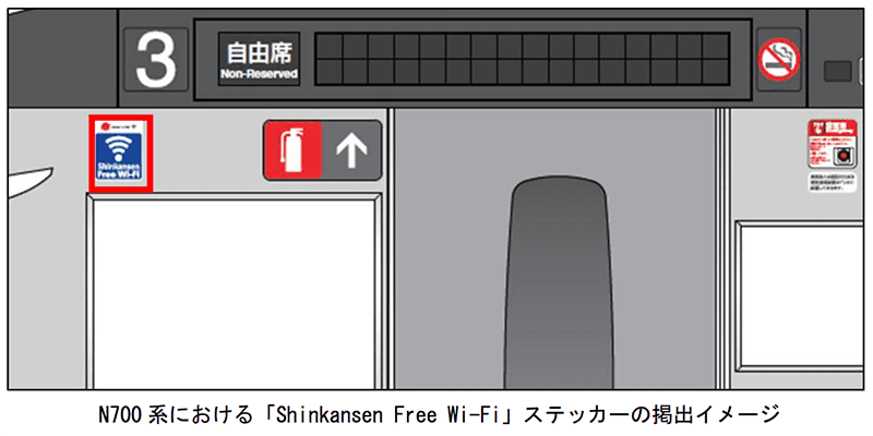 Shinkansen Free Wi-Fiは整備が完了した車両から順次提供され、2020年3月までに東海道・山陽・九州新幹線の全列車で利用できるようになる予定。利用可能な車両にはShinkansen Free Wi-Fiのステッカーが客室内に貼られているほか、JR東海では公式Webサイトにて案内するとしています。