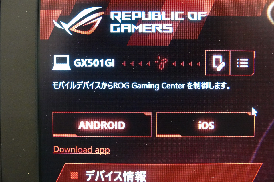 GAMING CENTERアプリとモバイル端末との連携機能は、GM501だけではなくGX501やその他のROGブランドのノートパソコンであればほぼ全てで利用可能とのことです。