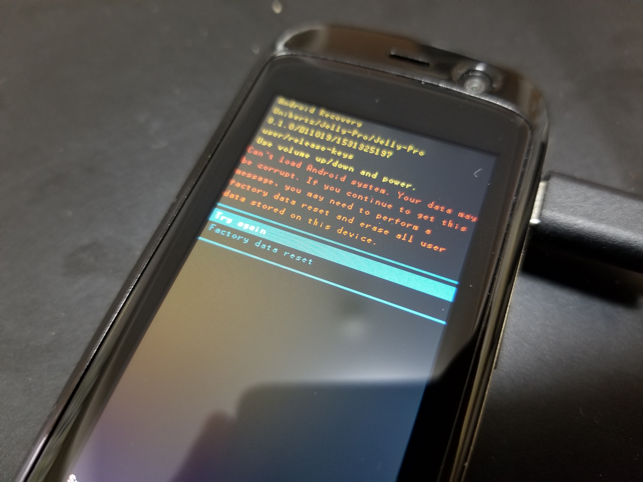 データが壊れていると表示されてしまったので、仕方なくボリュームキーでファクトリーリセットを選択し次の画面へ.......。