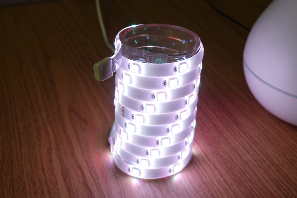 スマートLEDストライプライトはテレビや飾り棚、ベッドサイドなどに貼り付けることで間接照明的に利用できるもので、各所に自由に貼れるテープが付いているのでどこにでも設置できます。このLEDライトも1677万色対応となっているためスマートアロマディフューザーやスマートルームランプなどと色調を合わせて利用することが可能です。