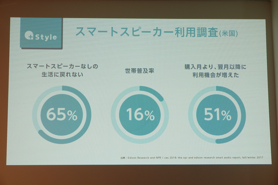 また米国でのスマート家電の普及率や利用者の声を例に挙げ「スマートホームは伸びていく」、「日本でも十分なポテンシャルはある」として今後の日本でのスマート家電の伸びしろに期待を寄せ、その市場へのアプローチとして+styleでのスマート家電の取り扱いを充実させていく方針を述べました。