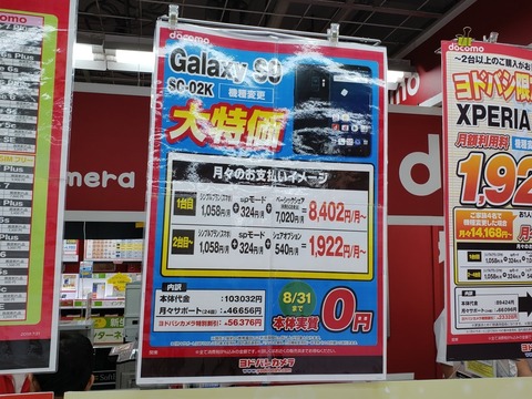 ■【ヨドバシ】ドコモのGalaxy S9が機種変更で実質0円に、56,000円割引を8月末まで延長